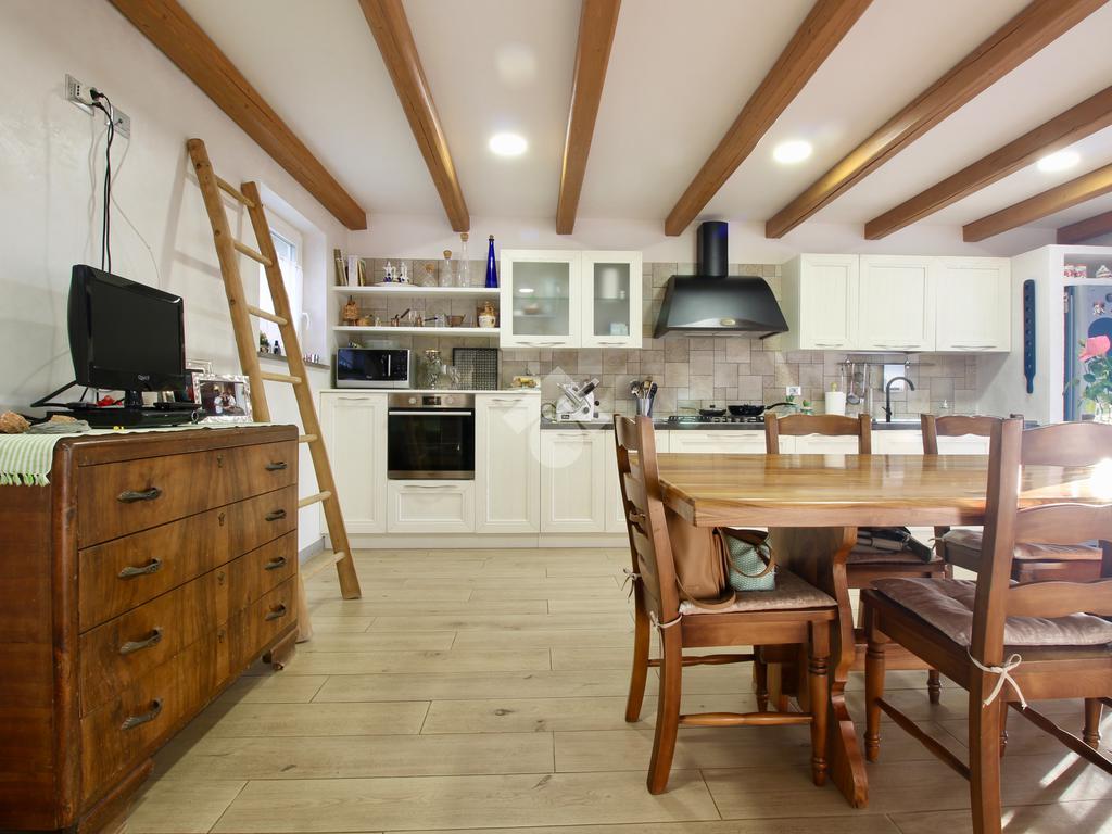 Il piano terra, fornito di riscaldamento a pavimento, è formato da un abbondante e luminoso soggiorno decorato con pietra di Torreano fiammata collegato direttamente alla bellissima cucina abitabile; due vetrate scorrevoli permettono, oltre al passaggio di luce ed aria, anche di raggiungere il giardino piantumato a nuovo compreso di impianto irrigazione ed il porticato esterno.